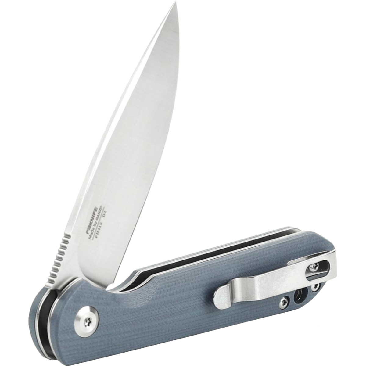 Нож оснащён флиппером для быстрого открывания одной рукой. Рукоять выполнена из стеклотекстолита G10 — прочного, термостойкого и устойчивого к износу материала. Для надёжного хвата предусмотрен упор под палец, повышающий безопасность при работе.
