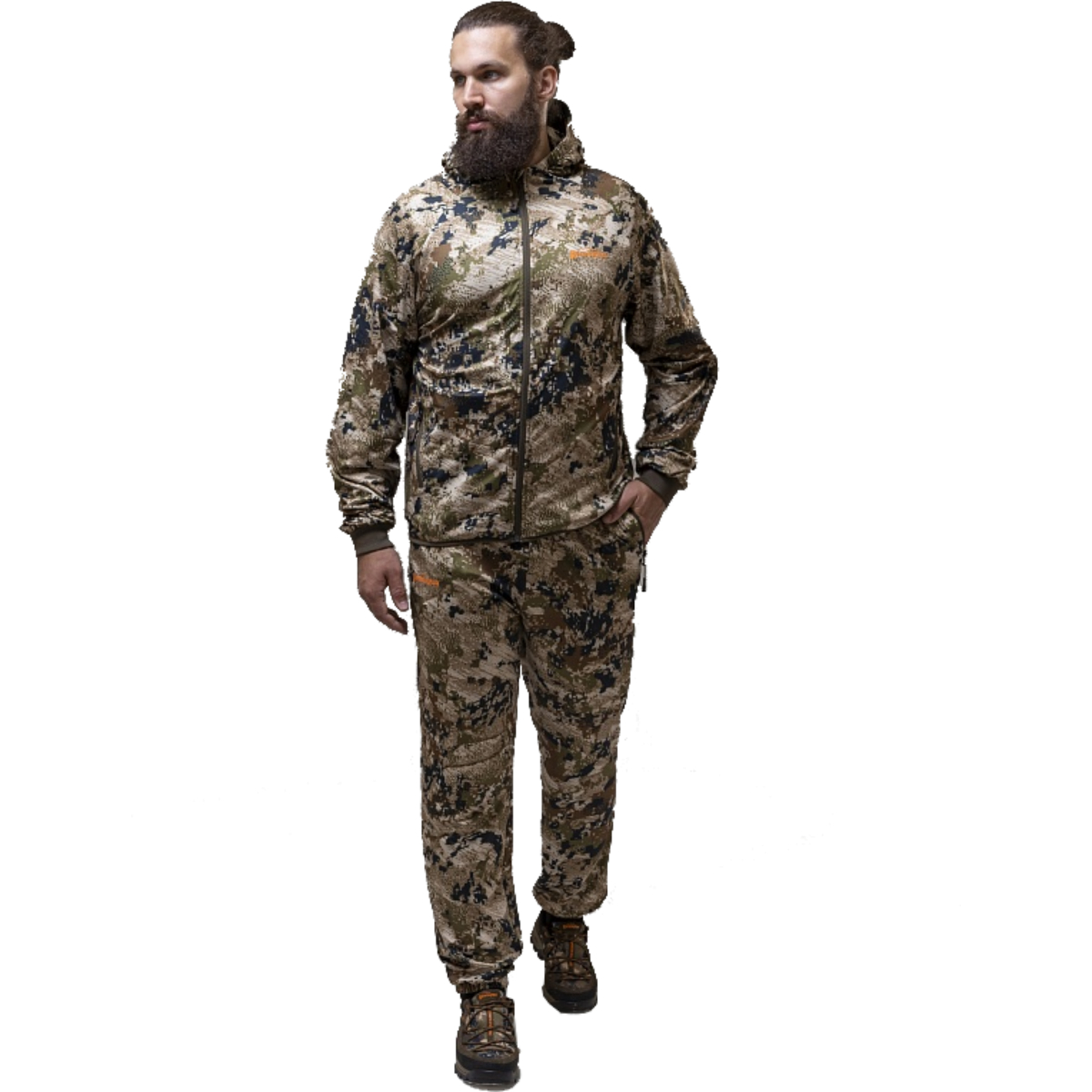 Костюм можно использовать как самостоятельный вариант или как утепляющий слой. Манжеты на рукавах и резинка по низу брюк защищают от ветра, а втачной капюшон сохраняет тепло и служит маскирующим элементом.