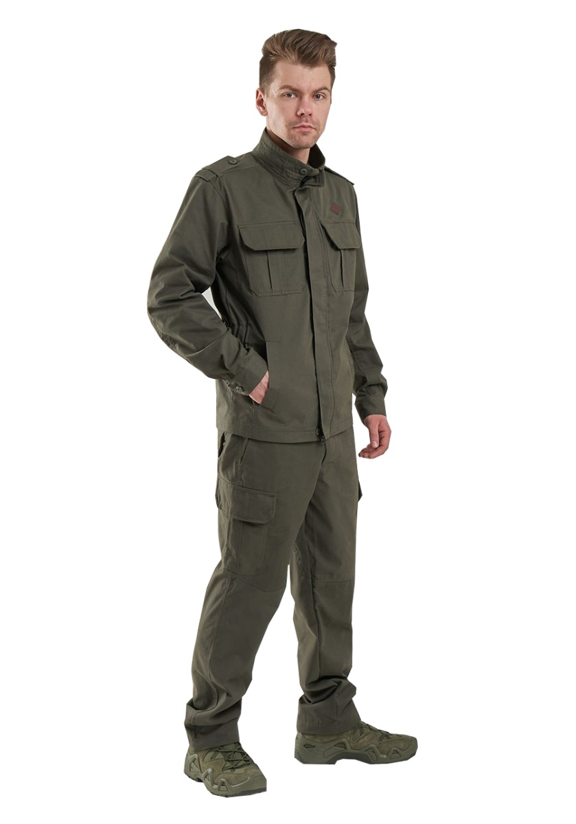 Куртка имеет классический крой с акцентами милитари стиля, такими как плечевые погончики и карманы с клапанами. Она обладает отличной посадкой, подчеркивающей мужской характер и стиль. Брюки выполнены в классическом крое и средней посадкой.
