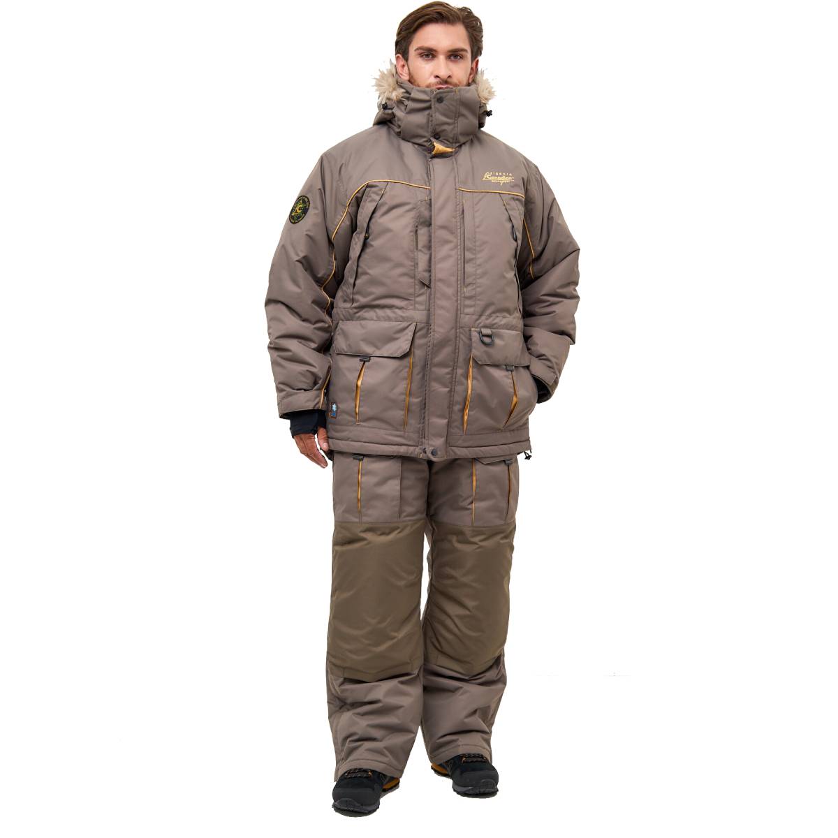 Костюм имеет высокие боковины на полукомбинезоне, внутренние манжеты на рукавах, усиленную защиту коленей и сиденья, а также вентиляцию на куртке и полукомбинезоне для регулировки температуры. Вшитая флисовая подкладка, большие утепленные карманы и мех на капюшоне добавляют комфорта.