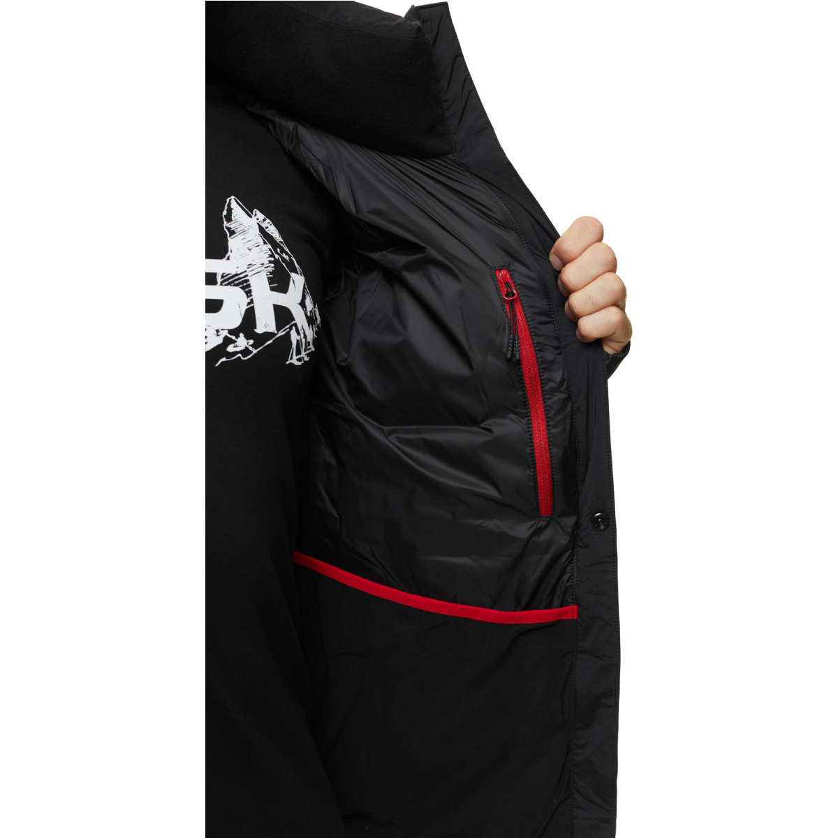 Среди ключевых особенностей — теплый воротник-стойка, съемный капюшон с утяжкой, ветрозащитная планка, регулируемые манжеты и светоотражающие элементы для дополнительной безопасности. Карманы включают два боковых с молниями, два внутренних сетчатых и один на молнии.