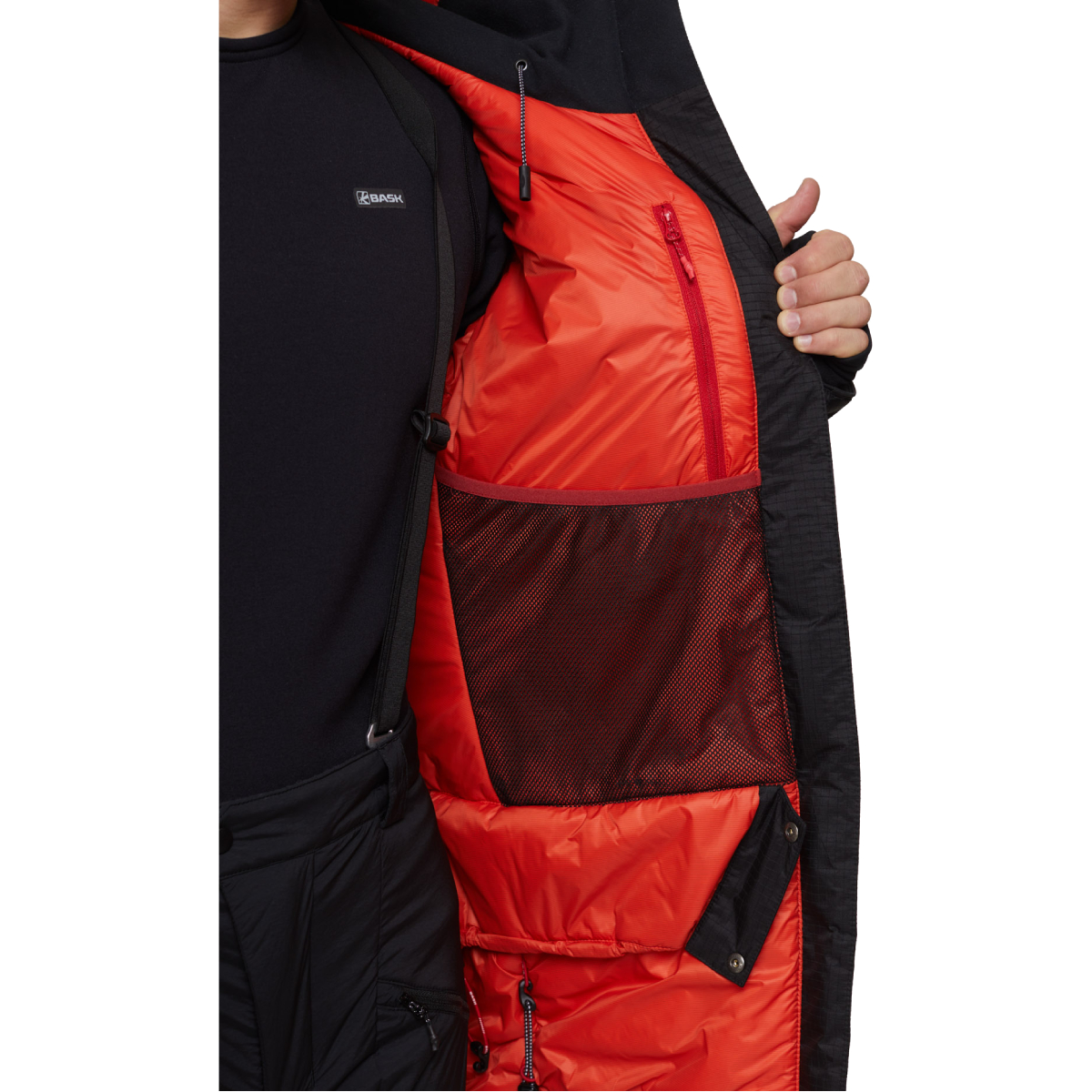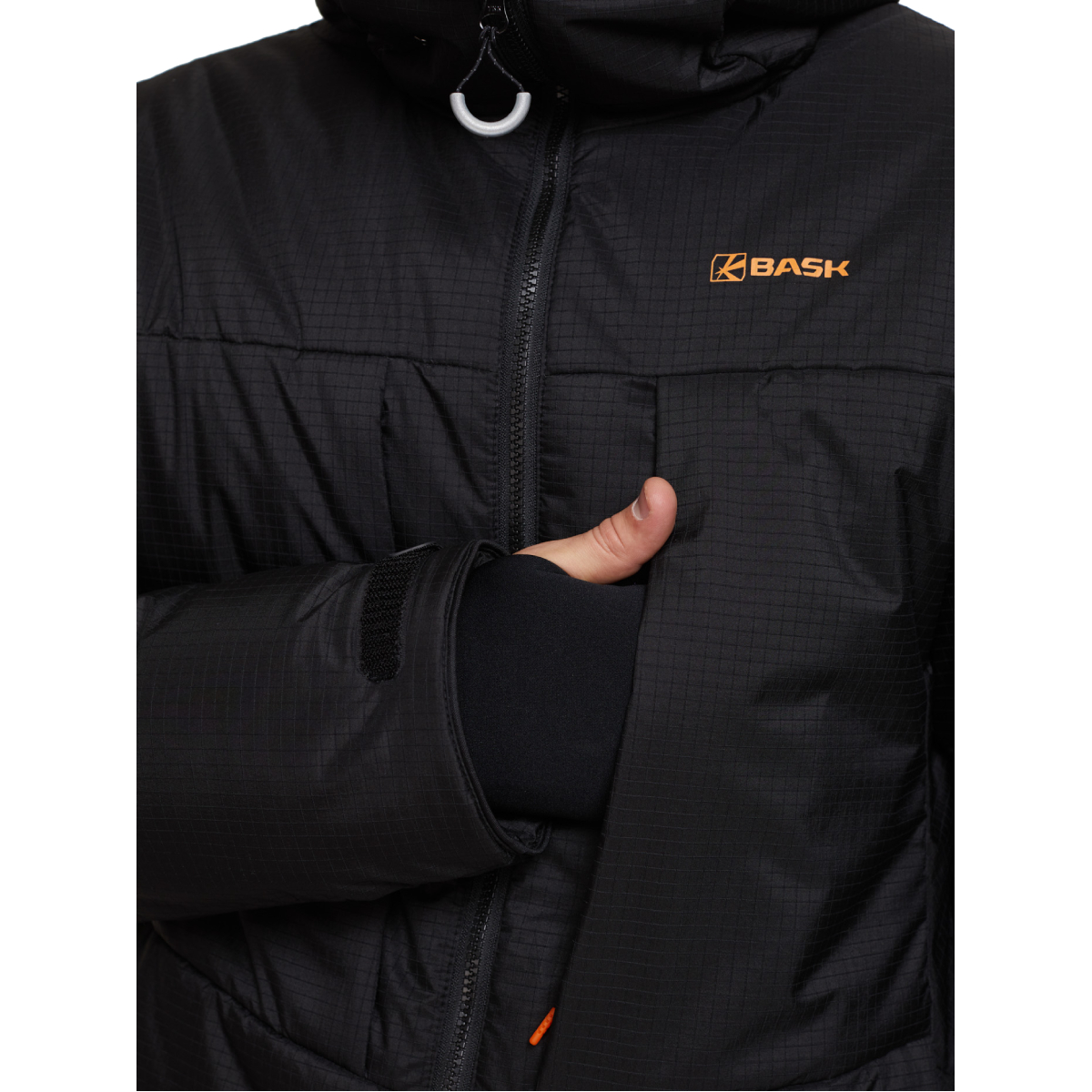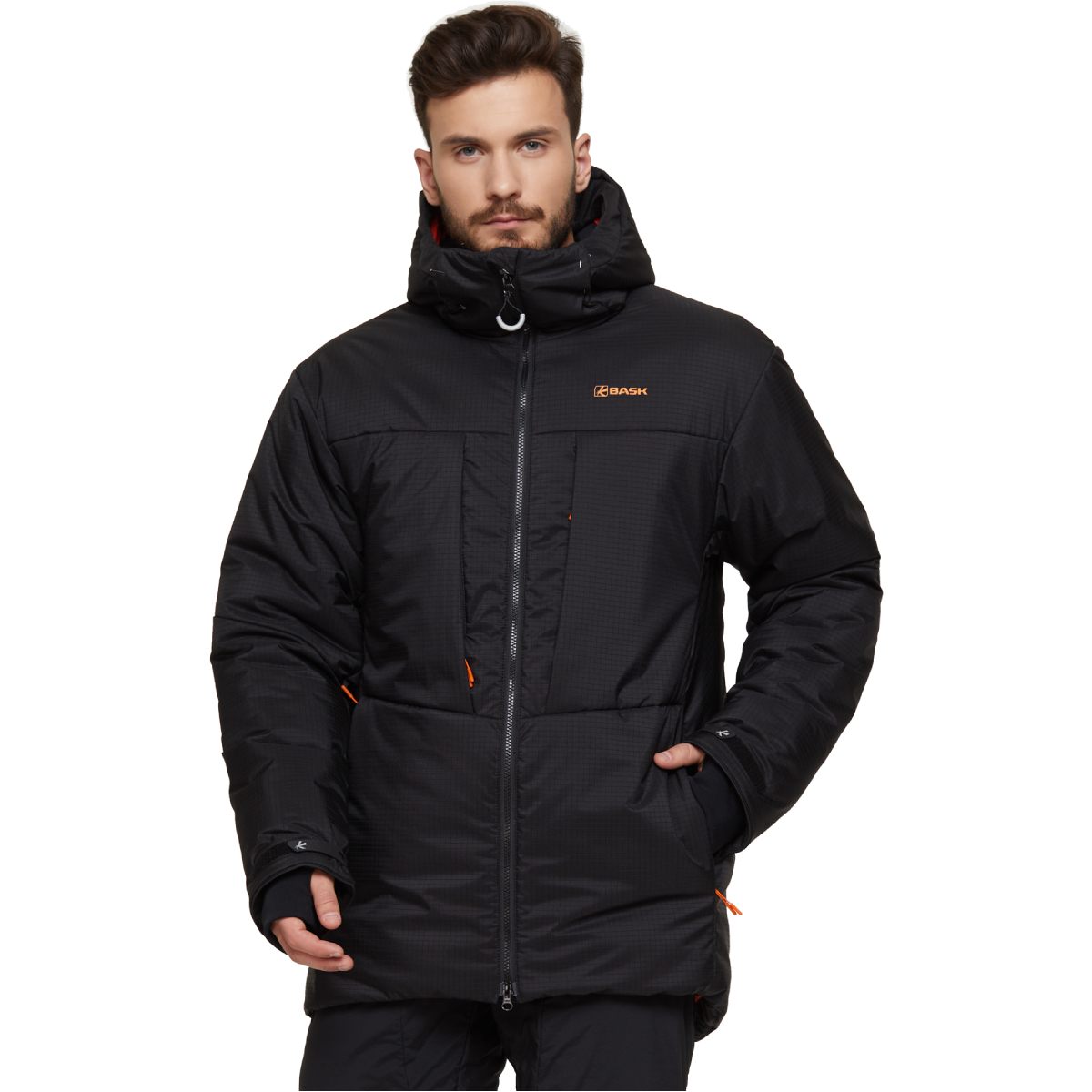 Для удобного хранения вещей предусмотрены два утеплённых боковых и два нагрудных кармана, а также четыре внутренних кармана (два на молнии и два сетчатых). Анатомическая форма локтевой зоны рукавов, снегозащитная юбка и утяжка по низу куртки повышают функциональность, а простота ухода и ремонта делает модель практичной для любых условий.