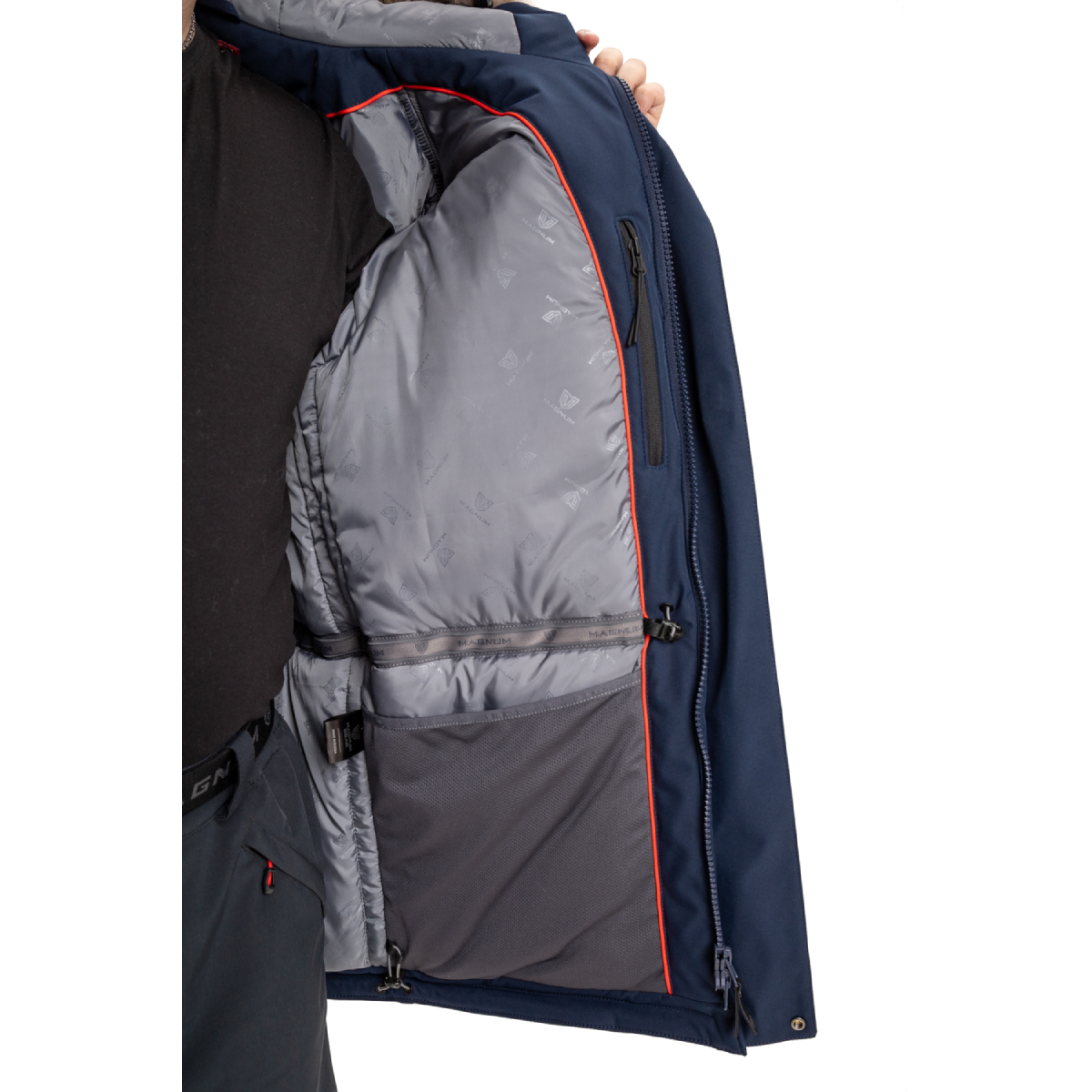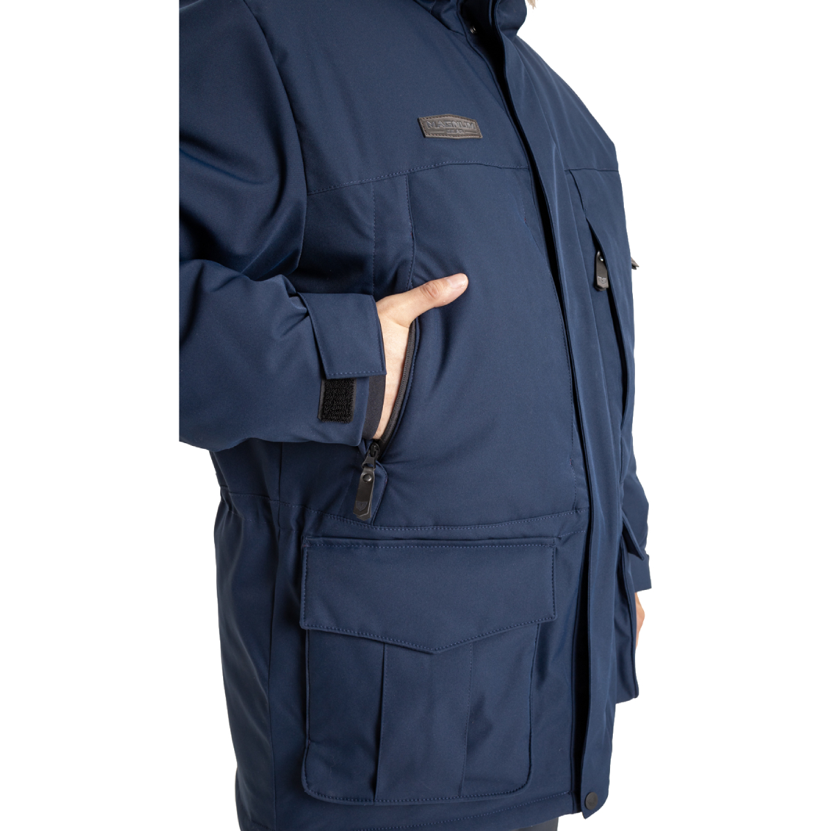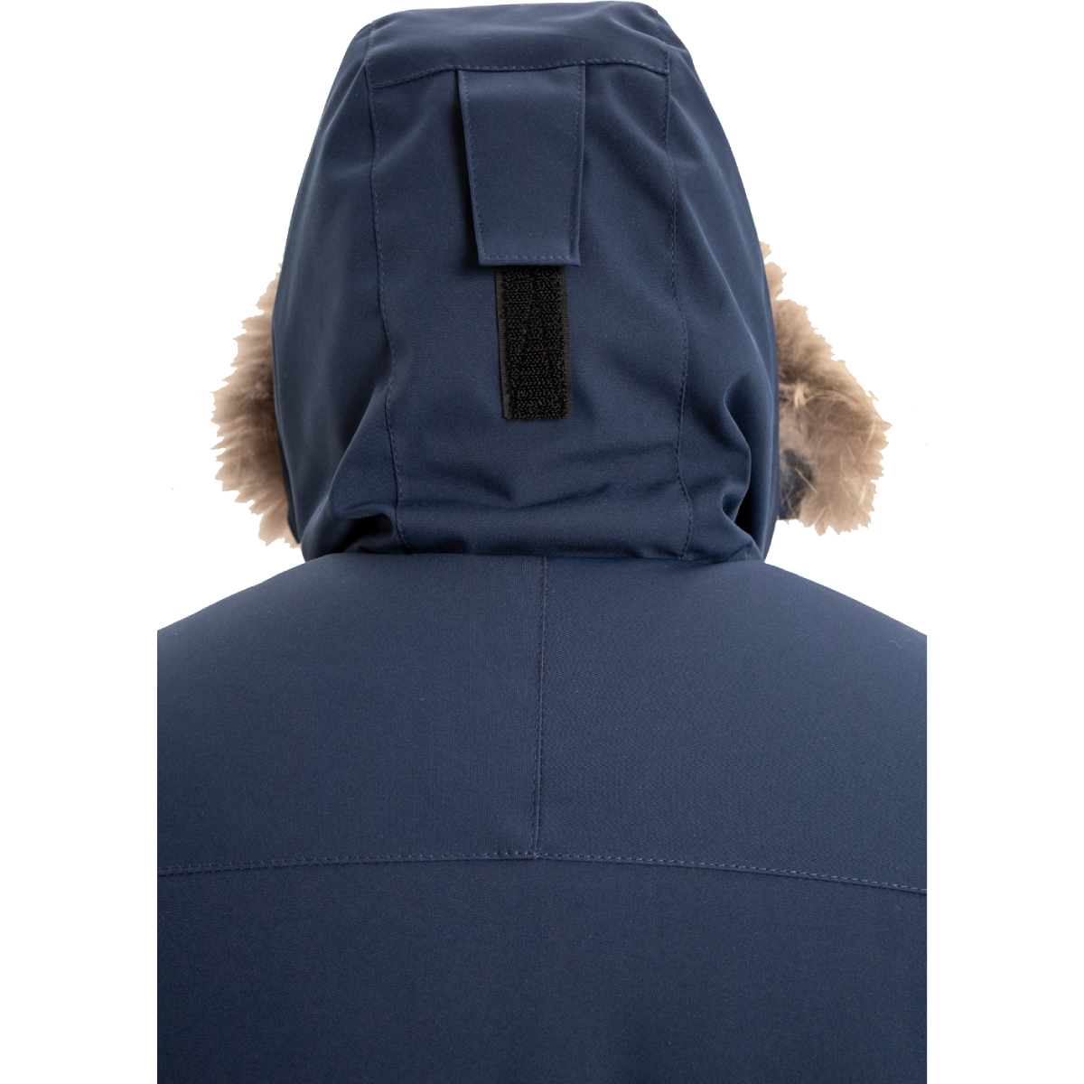 Куртка оснащена центральной молнией с двойным ветрозащитным клапаном, регулируемым капюшоном со съемной меховой опушкой из енота и внутренними утяжками по талии и низу. Для удобства предусмотрены фирменные теплые карманы для рук, 4 нагрудных кармана, 2 накладных, 2 внутренних и сетчатый карман.