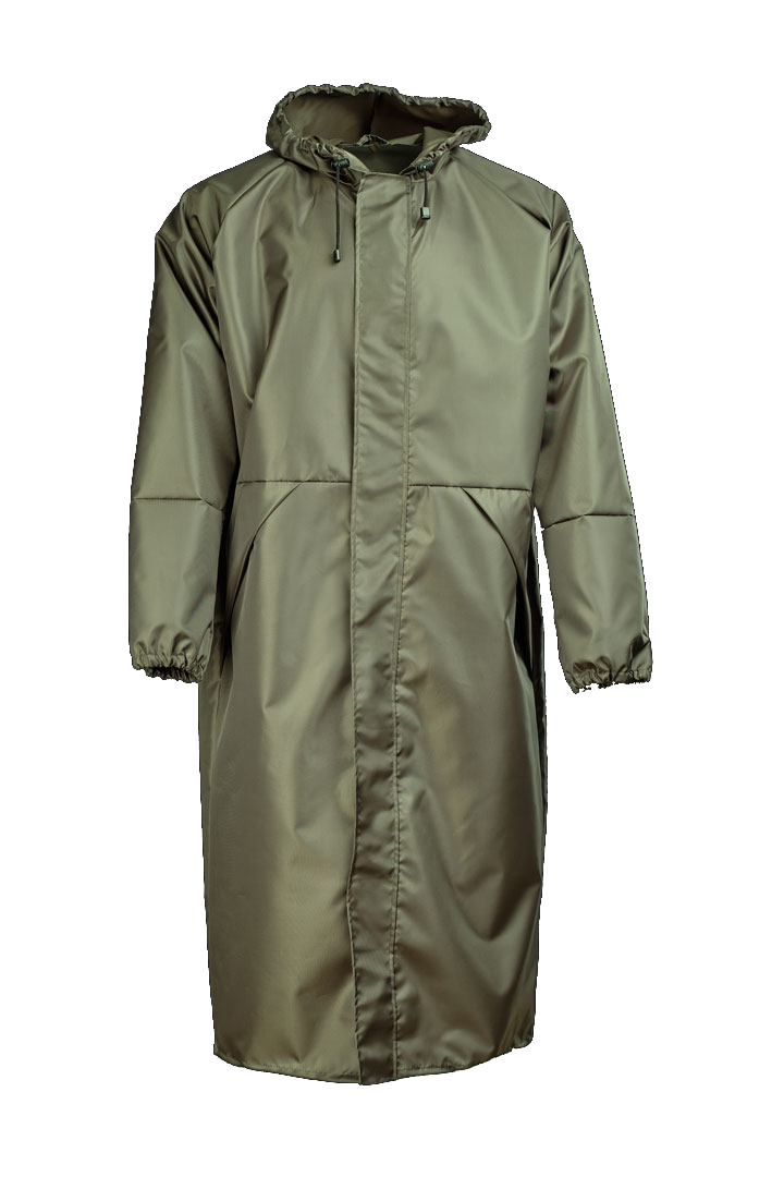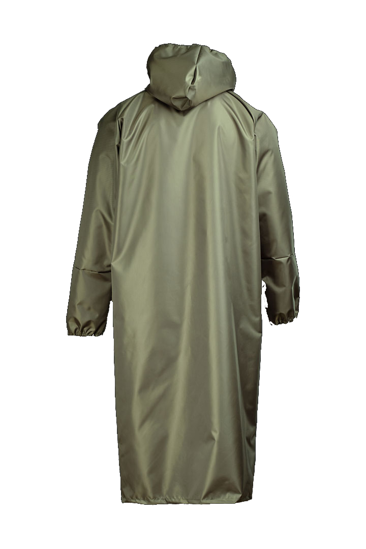 Плащ свободного кроя. Размеры разработаны с учетом того, что плащ одевается на верхнюю одежду. Глубокий капюшон с утяжкой шнурком на фиксаторах, с молнией, закрытой планкой, с карманами на линии пояса по бокам. Низ рукава-манжет на резинке.