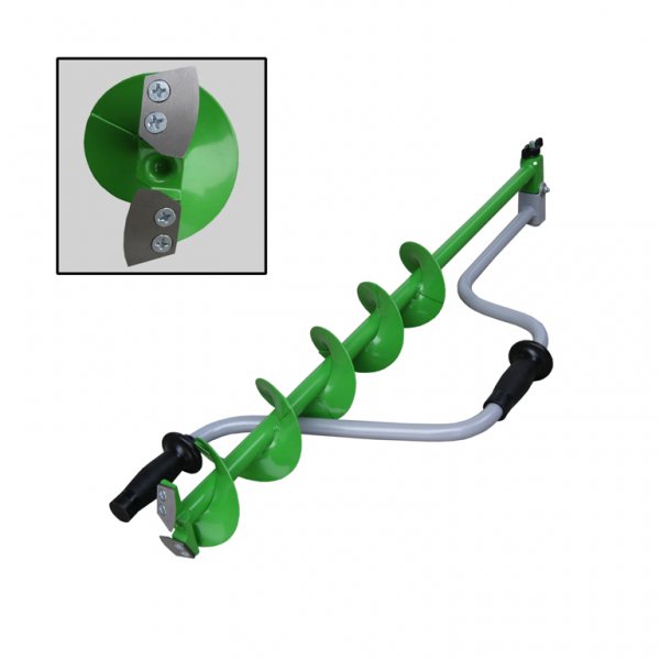 Ледобур Helios HS-110D - ледобур рыболовный складной шнековый с диаметром бурения 110мм. Верхняя рукоятка ледобура смещена относительно оси ледобура на 130 мм, а нижняя на 150 мм. Такое расположение рукояток позволяет вращать ледобур одновременно двумя руками, тем самым, увеличивая скорость бурения лунок во льду. Глубина бурения – 1000 мм. Вес ледобура - 2,1кг.