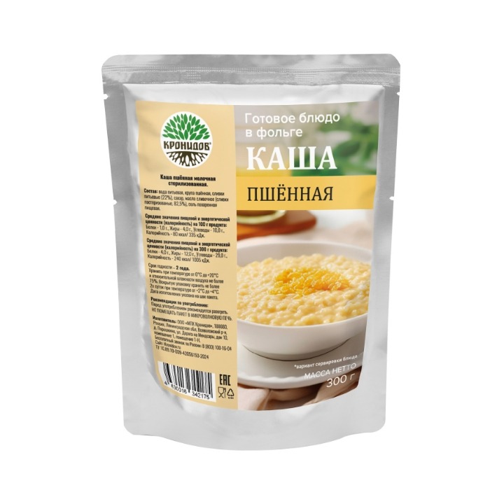 Вода питьевая, крупа пшеная, сливки питьевые (22%) , сахар, масло сливочное (сливки пастеризованые, 82,5%), соль поваренная пищевая.