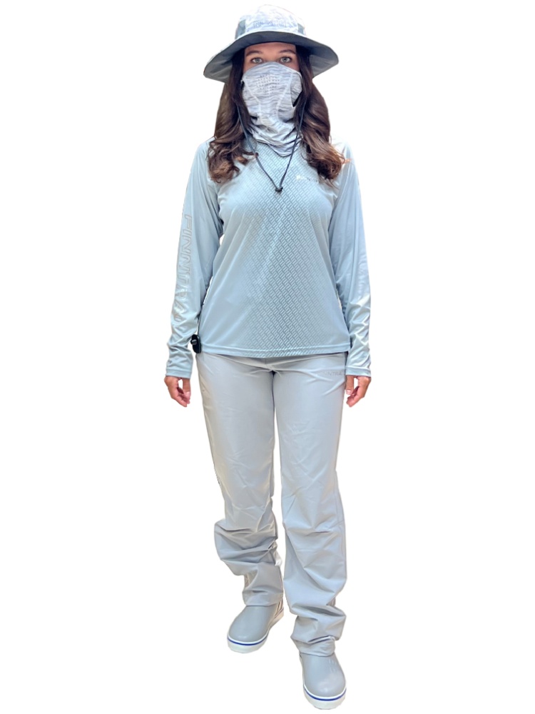 Основу образа составляет лонгслив Finntrail Venus с защитой от УФ и насекомых, в сочетании с дышащими брюками Wave с водоотталкивающим покрытием Teflon®. Для дополнительной защиты головы и шеи используются шляпа Norfin Shade Hat и снуд Sun Pro Ninja — оба изделия с уровнем UPF 50+.